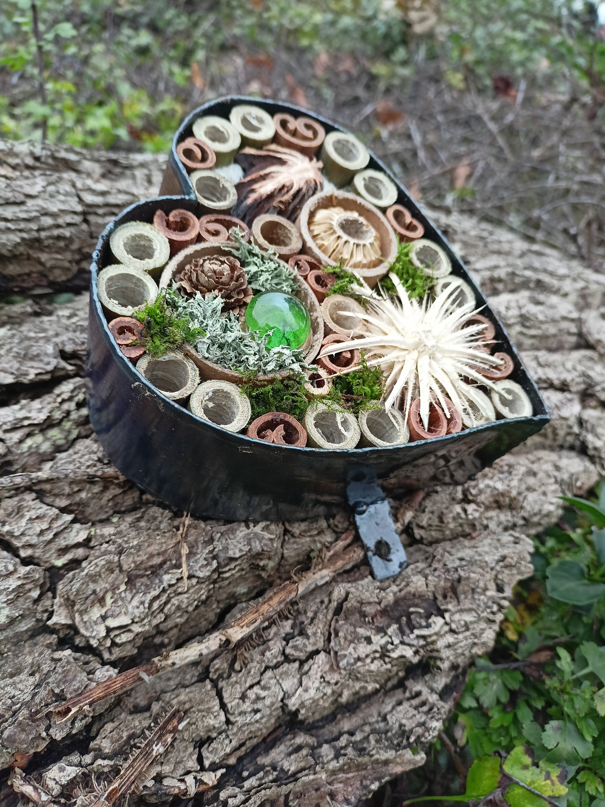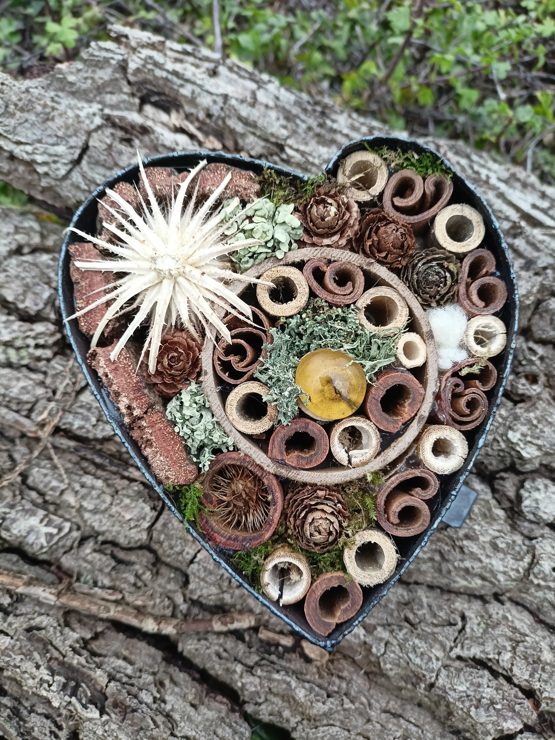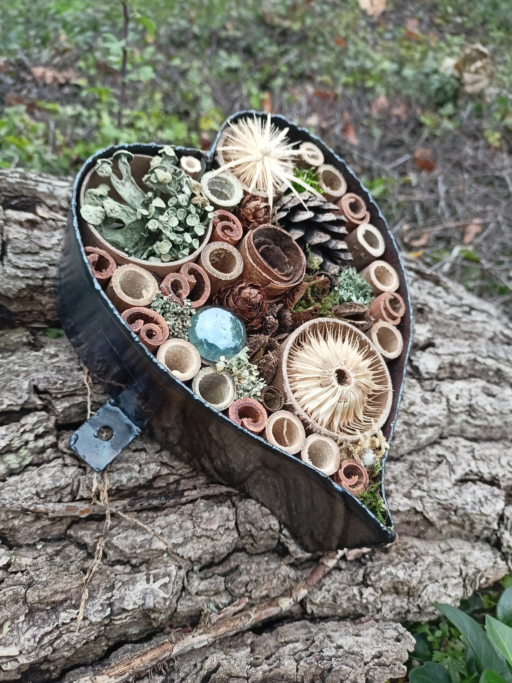 Each heart is individually made to your order. carefully hand crafted from !00% reclaimed metal and filled with a unique blend of organics that can serve as an insect refuge if the sculpture is placed in a sheltered spot outdoors. Available in two approximate sizes, the large is 260mm by 260 mm by 60mm.