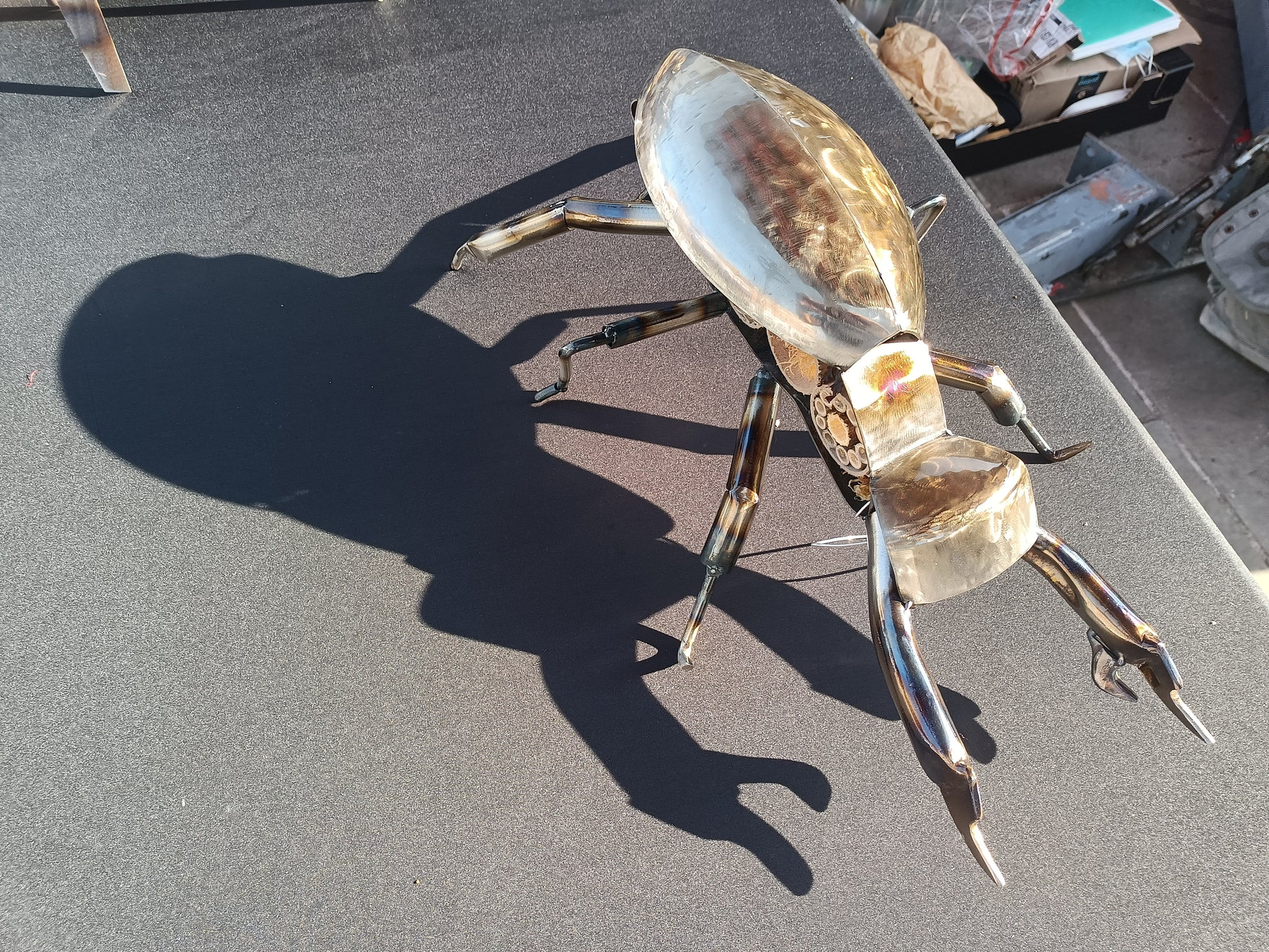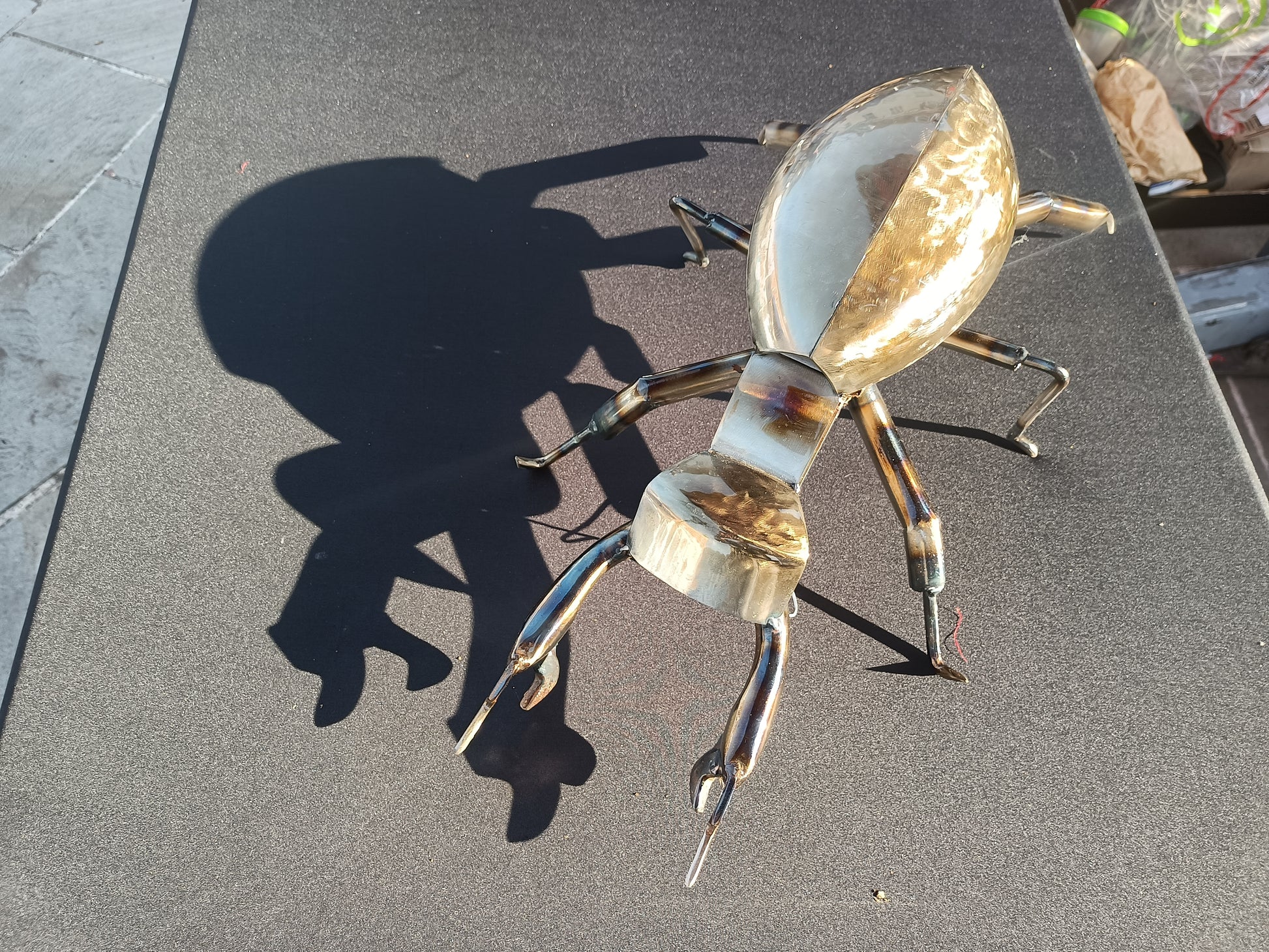 The wing cases on this handsome beetle are crafted from the curved top section of a glue canister. Ready for anything, this bold beetle will stand out from the crowd in any setting, indoors or out.
